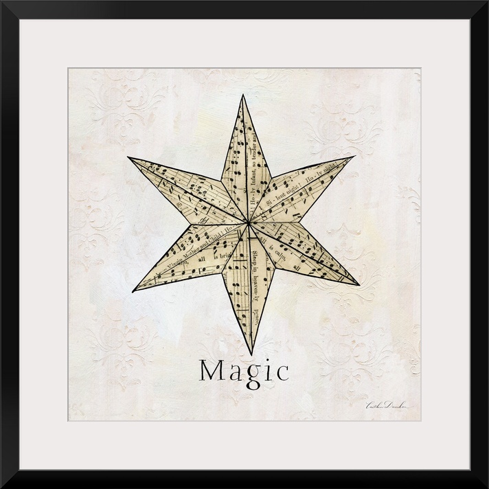 <p>"Magic" along with a star silhouette made of sheet music on a floral etched neutral background.</p>