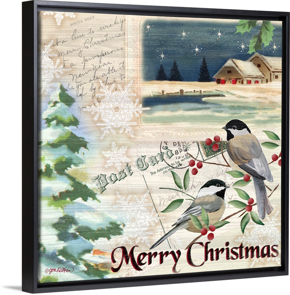 <p>An artistic design of two birds on a vintage postcard of a snowy scene and the text "Merry Christmas."</p>