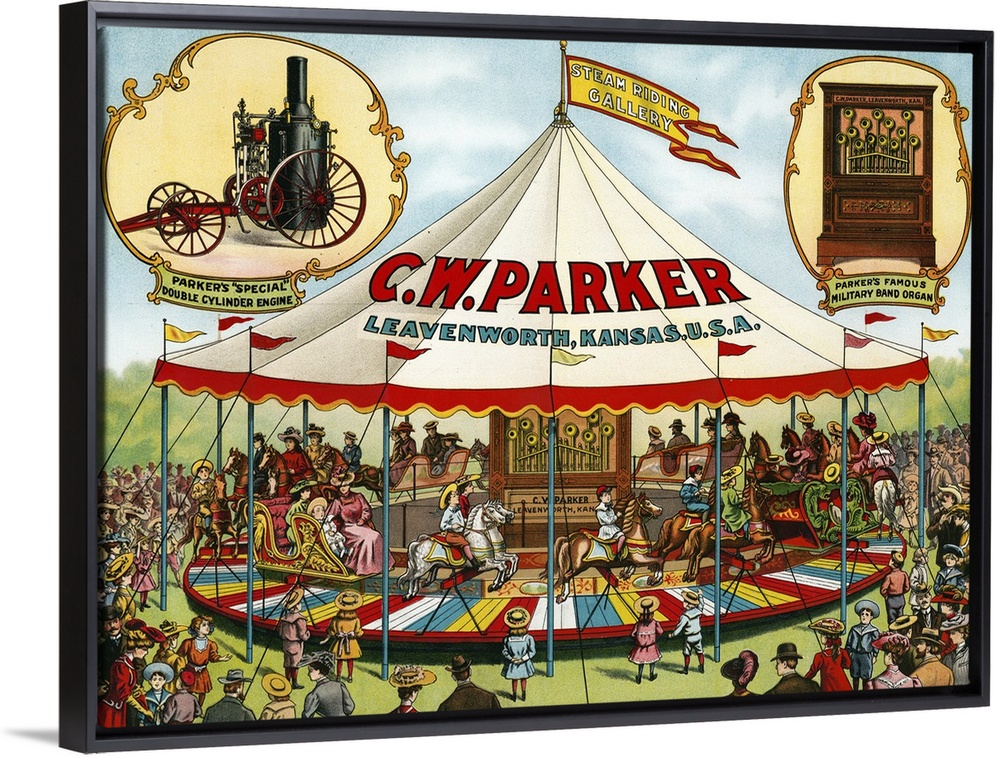 <p>Vintage circus poster of CW Parker Steam riding gallery Special double cylinder engine Military band organ</p>