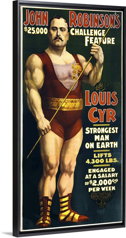 <p>Vintage circus poster of French Canadian strongman, Louis Cyr, circa 1898. It reads, John Robinson's $25,000 challenge feature - Louis Cyr, strongest man on earth, lifts 4300 lbs. Engaged at a salary of $2000 per week.</p>