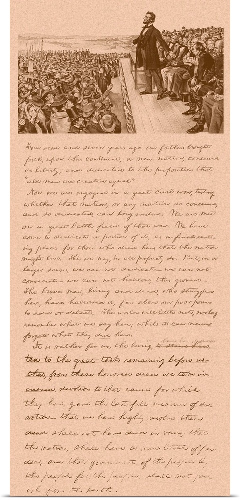 <p>Vintage Civil War era print of President Abraham Lincoln delivering the Gettysburg Address and a copy of his notes from that speech.</p>