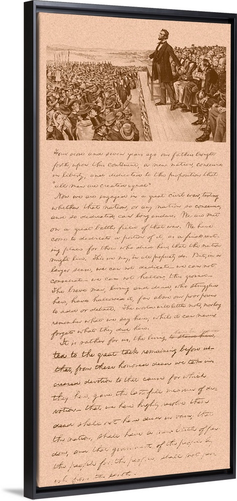 <p>Vintage Civil War era print of President Abraham Lincoln delivering the Gettysburg Address and a copy of his notes from that speech.</p>