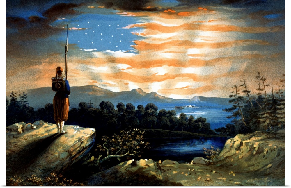 <p>Vintage Civil War painting of a lone Zouave sentry watching from a cliff, as the sky forms the red, white, and blue of The American Flag. The original was painted by William Bauly, 1861. It is titled, Our Heaven Born Banner.</p>