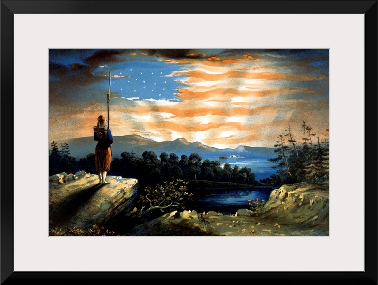 <p>Vintage Civil War painting of a lone Zouave sentry watching from a cliff, as the sky forms the red, white, and blue of The American Flag. The original was painted by William Bauly, 1861. It is titled, Our Heaven Born Banner.</p>