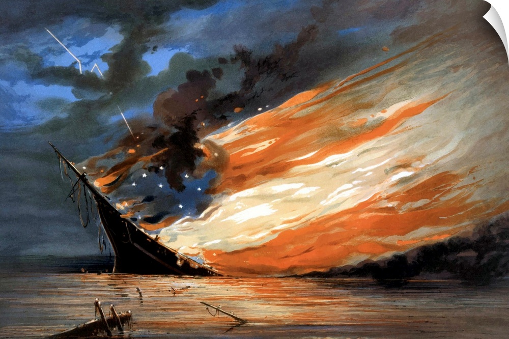 <p>Vintage Civil War painting of a warship burning in a calm sea. The flames of the fire form the red, white, and blue flag of the Confederacy. The original was painted by William Bauly, 1861. It is titled, The Fate Of The Rebel Flag.</p>