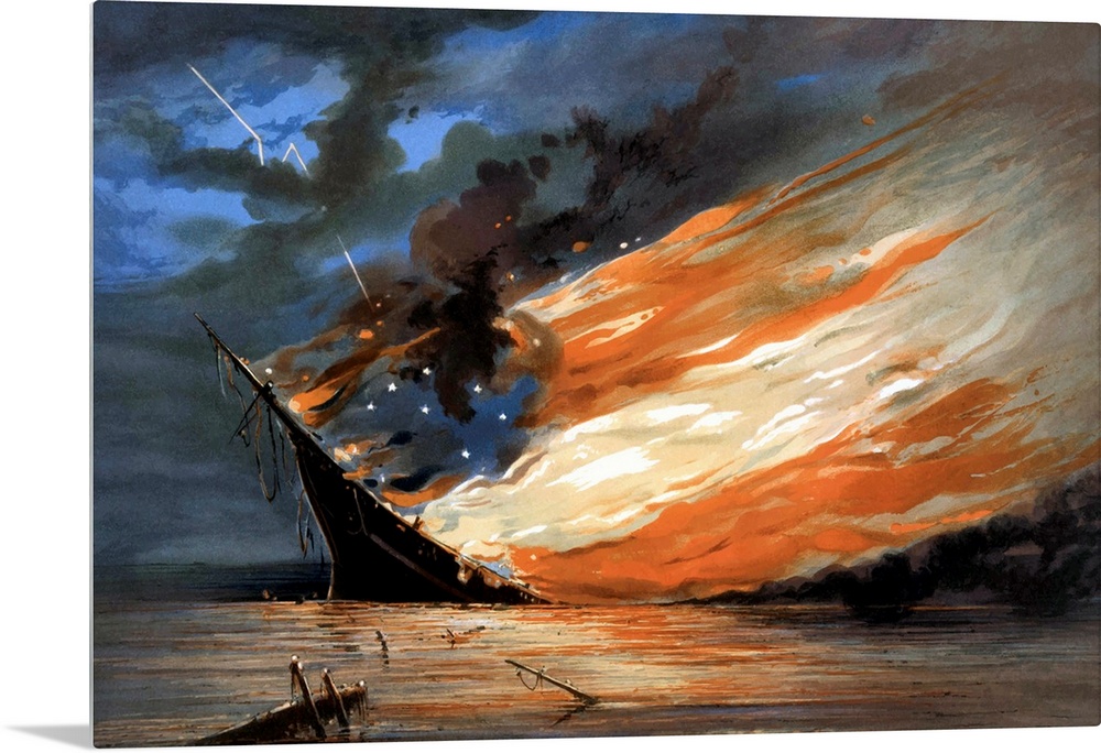 <p>Vintage Civil War painting of a warship burning in a calm sea. The flames of the fire form the red, white, and blue flag of the Confederacy. The original was painted by William Bauly, 1861. It is titled, The Fate Of The Rebel Flag.</p>