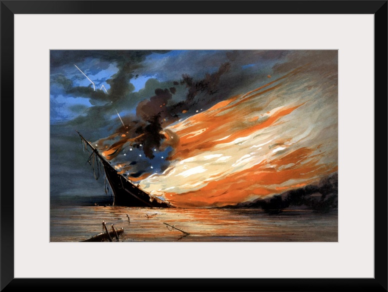 <p>Vintage Civil War painting of a warship burning in a calm sea. The flames of the fire form the red, white, and blue flag of the Confederacy. The original was painted by William Bauly, 1861. It is titled, The Fate Of The Rebel Flag.</p>