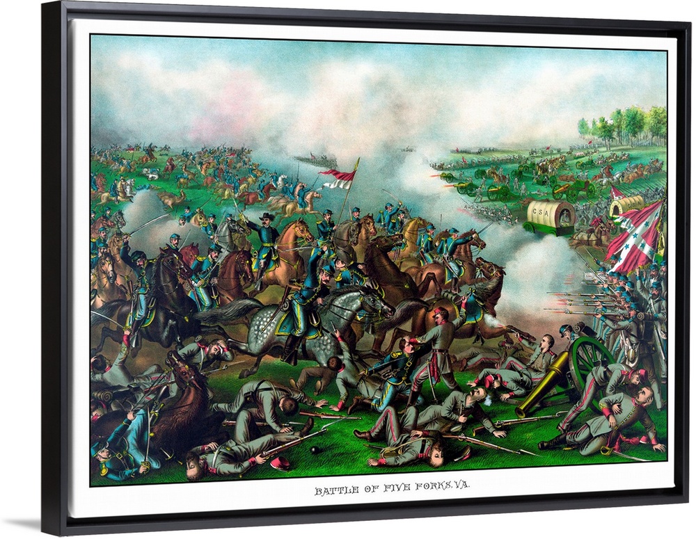 <p>Vintage Civil War Print of the Battle of Five Forks. General Philip Sheridan is prominently featured, riding on horseback and brandishing his sword. The battle was fought April 1, 1865 during the Appomattox Campaign. The Confederate loss, at Five Forks, triggered the eventual surrender of General Lee at Appomattox on April 9th. The print reads, Battle Of Five Forks, VA.</p>