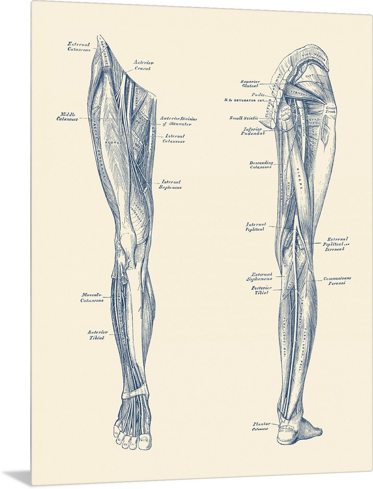 <p>Vintage diagram depicting the muscles and arteries in the legs.</p>