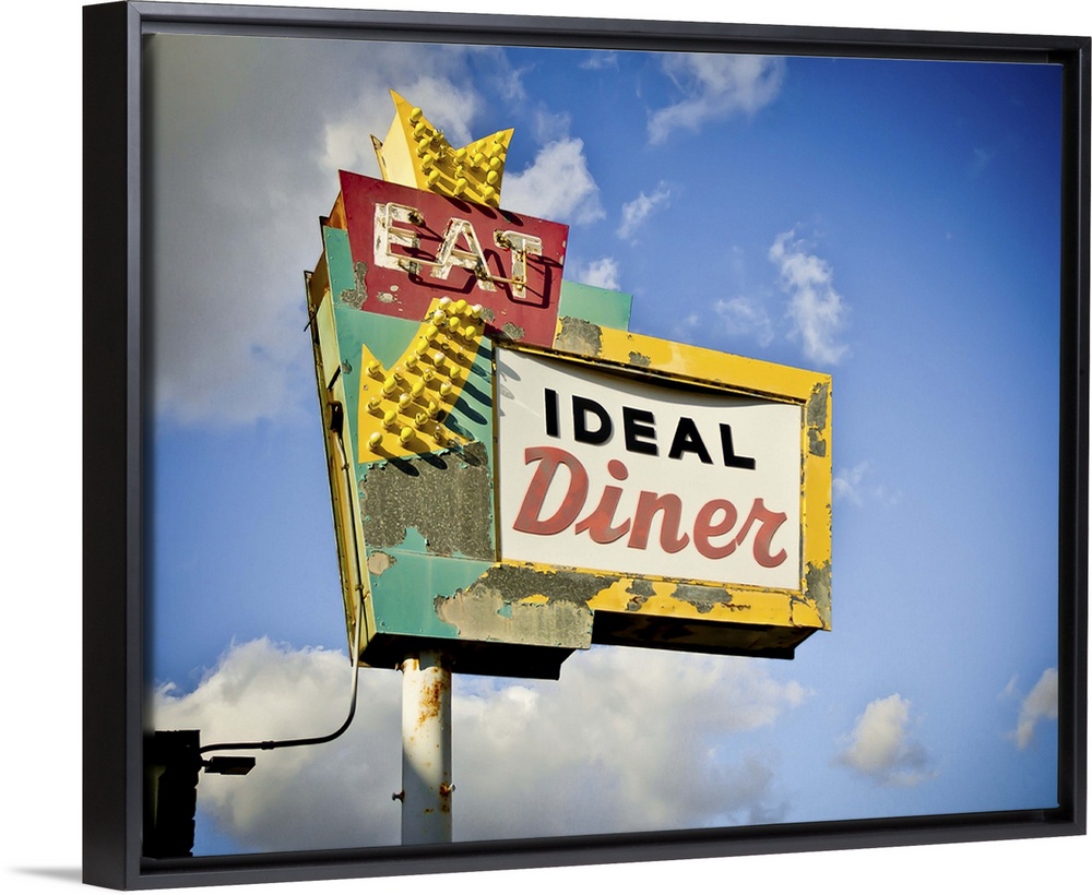 <p>Photograph of a retro restaurant sign against a cloudy blue sky.</p>