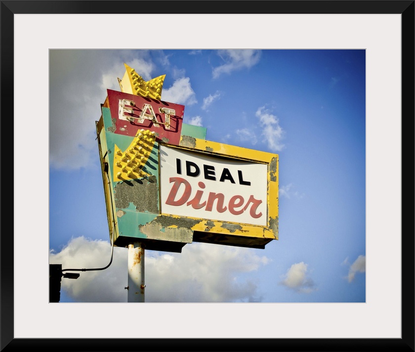 <p>Photograph of a retro restaurant sign against a cloudy blue sky.</p>