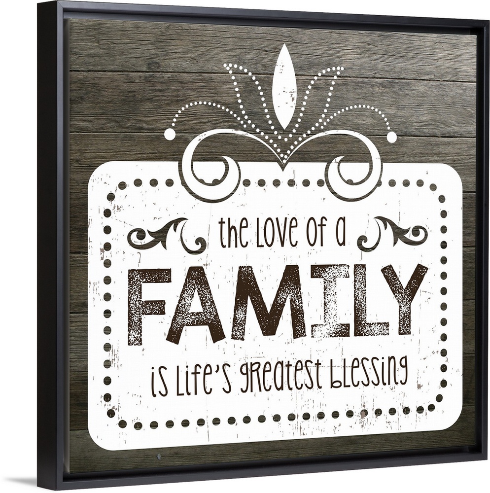 <p>The phrase "The love of a family is life's greatest blessing" on a vintage marquee shape over a faux wood texture.</p>