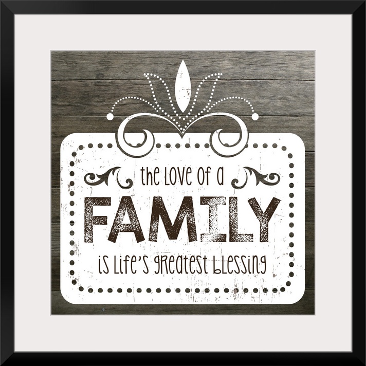 <p>The phrase "The love of a family is life's greatest blessing" on a vintage marquee shape over a faux wood texture.</p>