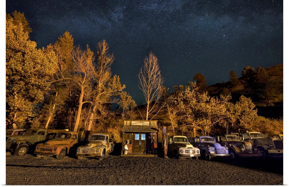 <p>Vintage gas station and old cars after dark in the Palouse, Washington.</p>