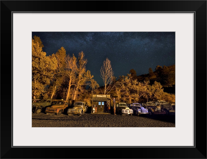 <p>Vintage gas station and old cars after dark in the Palouse, Washington.</p>