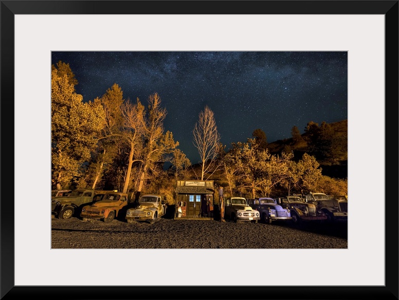 <p>Vintage gas station and old cars after dark in the Palouse, Washington.</p>