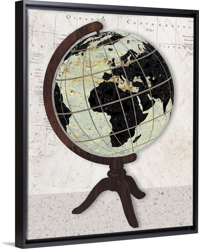 <p>Artwork of an antique old world globe, against a map print background.</p>