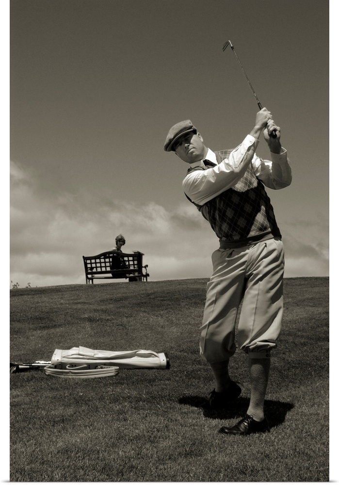 <p>A middle aged man playing golf.</p>