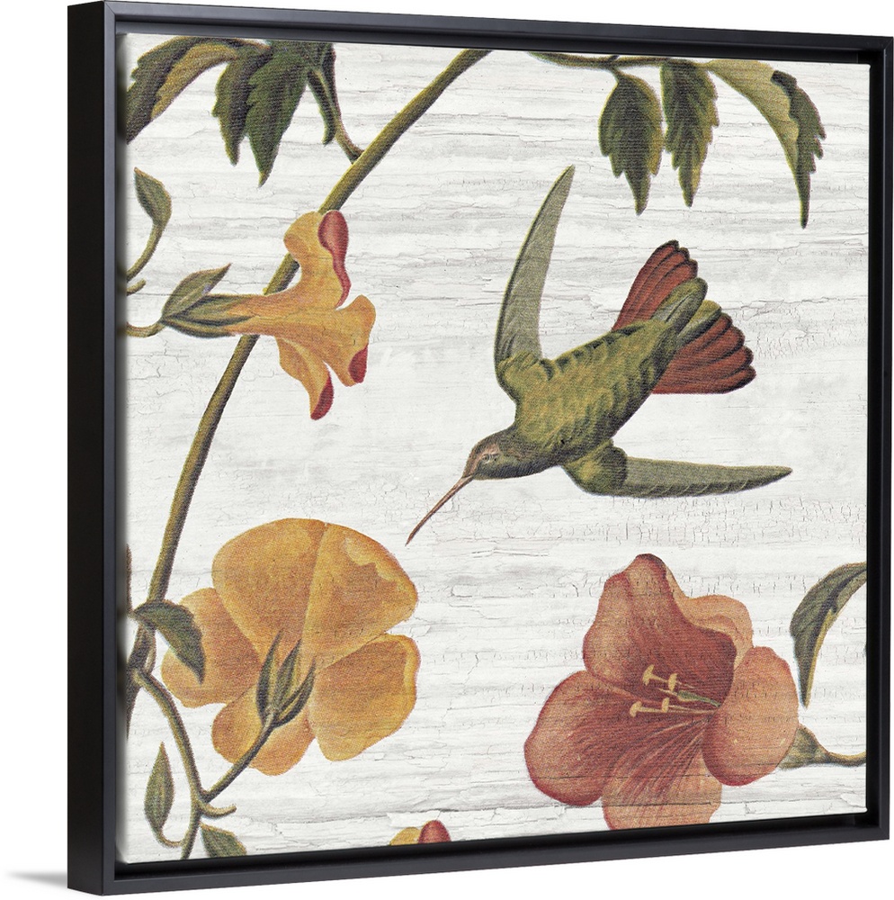 <p>Vintage stylized artwork of a hummingbird flying to a colorful flower against a weathered background.</p>