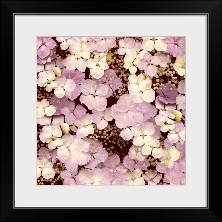 <p>A cluster of hydrangea flowers in shades of pink.</p>