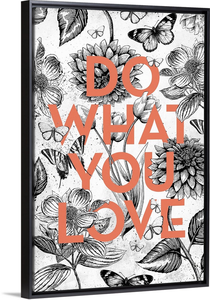 <p>A black and white vintage floral illustration with butterflies intertwined with the words Do What you Love in orange type.</p>