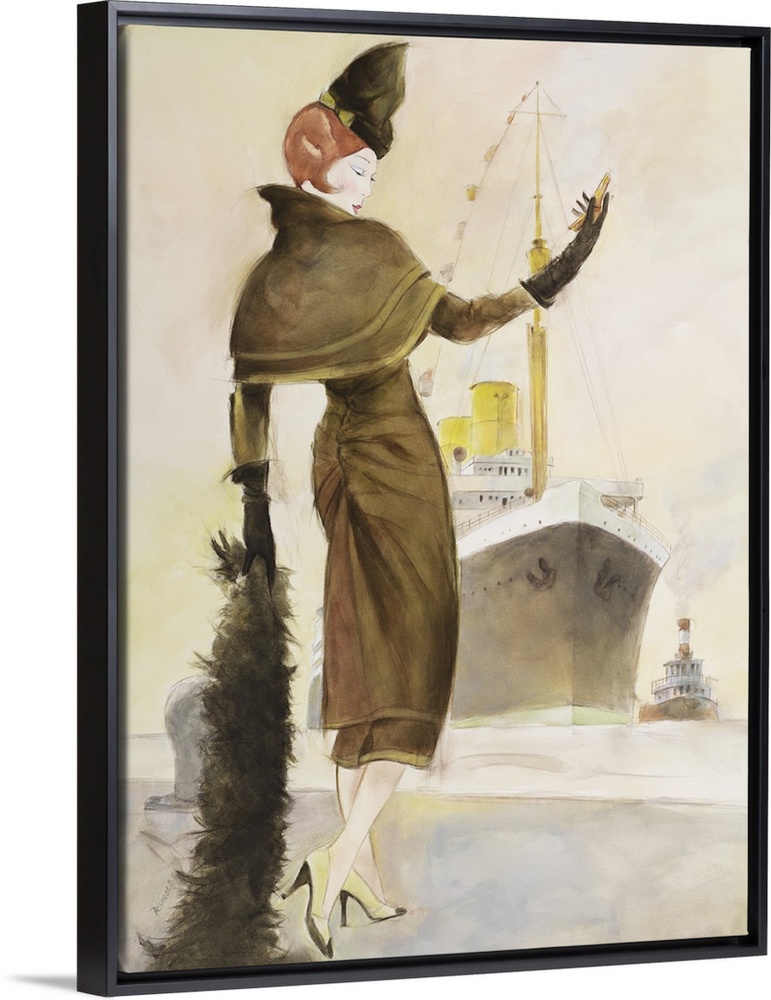 <p>Vintage style illustration of a woman in a fur coat awaiting a ship.</p>