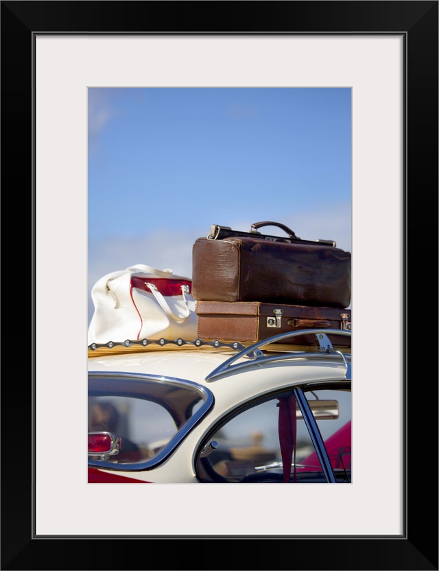 <p>Vintage antique luggage bags on wooden roof rails of old car.</p>