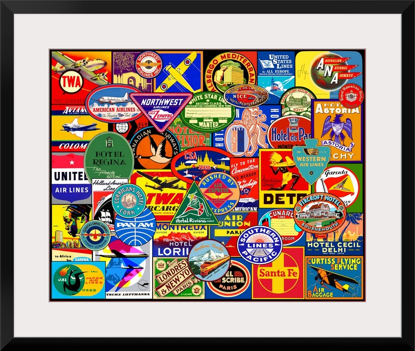 <p>A collage of luggage labels from hotels, ships, trains and planes.</p>