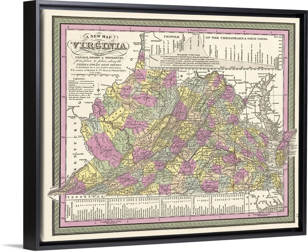 <p>Oversized, horizontal, vintage map of Virginia, detailed with its canals and roads, and including distances from one place to another. Surrounded by several different colored thin borders.</p>