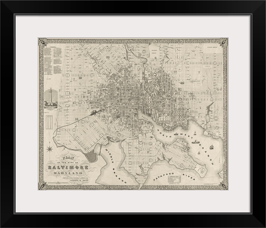 <p>Landscape, large wall hanging of a detailed vintage map plan of Baltimore, Maryland.</p>