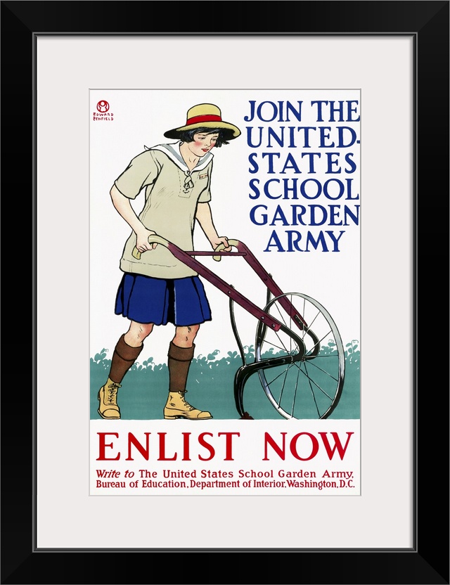<p>20th century U.S. military history print of a school girl operating the plow, along with the caption 'Join the United States School Garden Army' at the top. Created in 1917 by the War Department, the USSGA's main purpose was to encourage school children to indulge in gardening, and by Armistice Day, it had received several million responses from school children, all of whom had enlisted as 'Soldiers of the Soil'.</p>