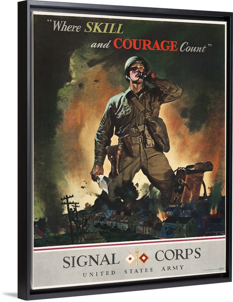 <p>Vintage military recruiting poster showing an American soldier talking on a field telephone.</p>