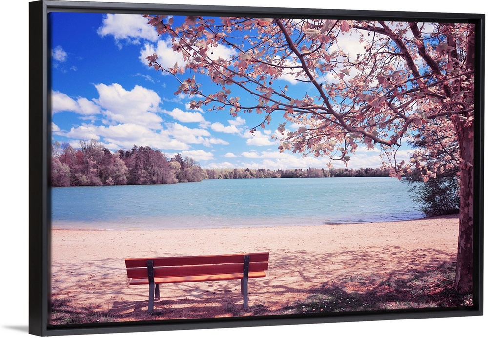 <p>This spring time landscape photograph shows and empty park bench under a blossoming cherry tree beside and lake on a beautiful sunny day.</p>