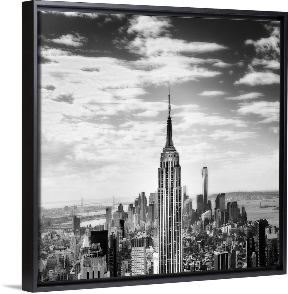 <p>Black and white square photograph of New York City from a bird's eye view, highlighting the Empire State Building.</p>