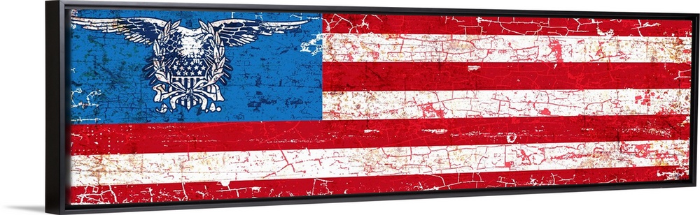 <p>Vintage rusty 1890's distressed trade sign wall art of a long horizontal stylized American flag with an eagle in star area.</p>