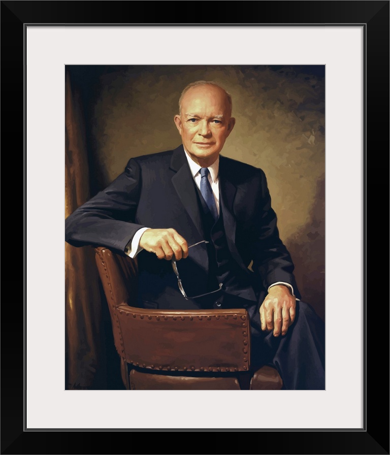 <p>Vintage painting of President Dwight D. Eisenhower seated in a chair.</p>