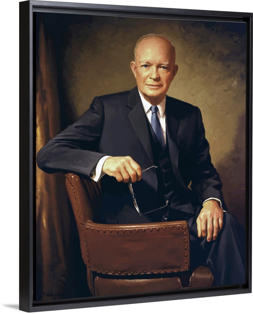 <p>Vintage painting of President Dwight D. Eisenhower seated in a chair.</p>