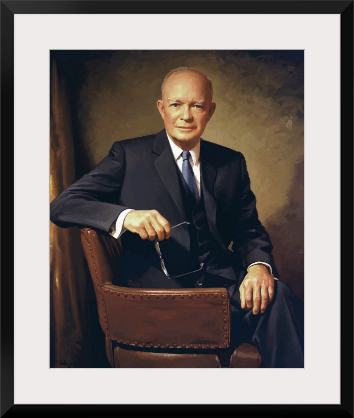 <p>Vintage painting of President Dwight D. Eisenhower seated in a chair.</p>