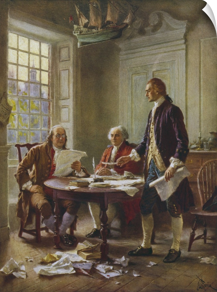 <p>Vintage painting of Benjamin Franklin, John Adams, and Thomas Jefferson writing the Declaration of Independence.</p>