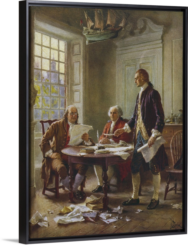<p>Vintage painting of Benjamin Franklin, John Adams, and Thomas Jefferson writing the Declaration of Independence.</p>