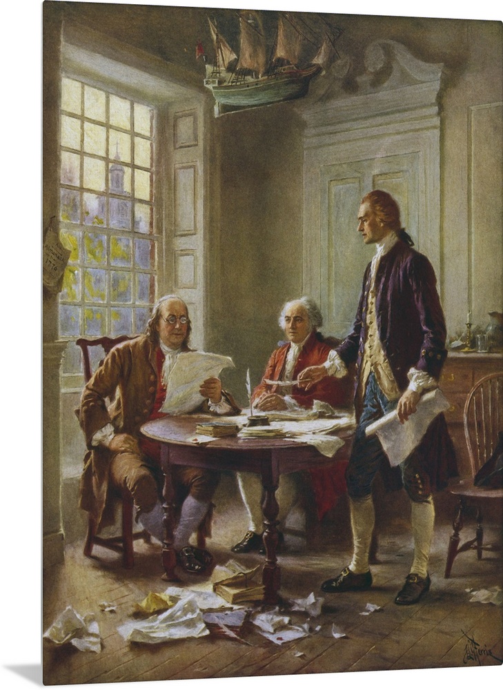 <p>Vintage painting of Benjamin Franklin, John Adams, and Thomas Jefferson writing the Declaration of Independence.</p>