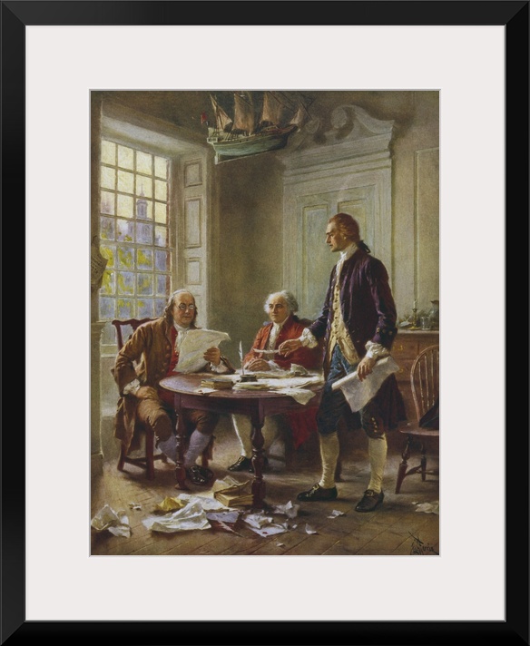 <p>Vintage painting of Benjamin Franklin, John Adams, and Thomas Jefferson writing the Declaration of Independence.</p>