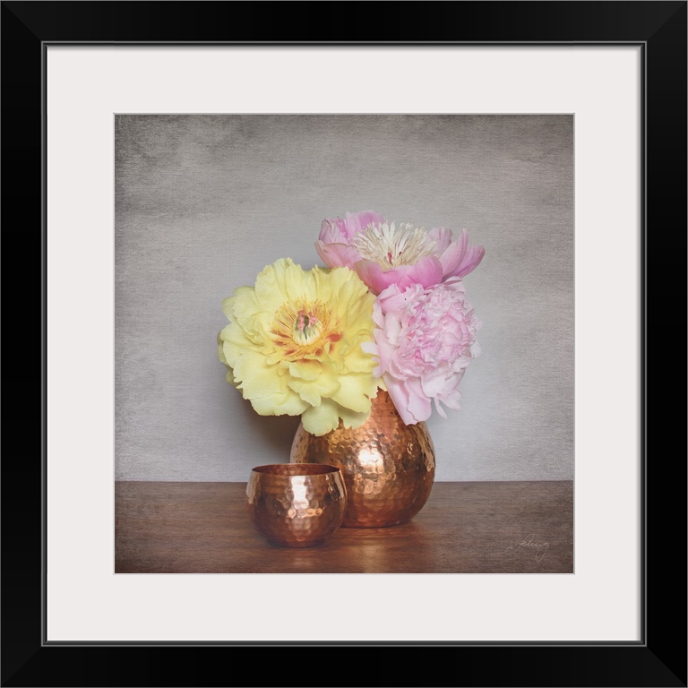 <p>Still life photograph of a copper vase full of pink and yellow peonies with a distress overlay.</p>