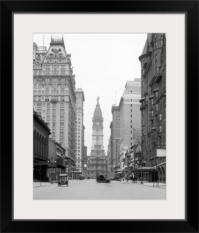 <p>This is a vintage photograph in black and white of downtown Philadelphia. Tall buildings line the street that has cars driving in it with a clear view of the city hall tower at the end.</p>