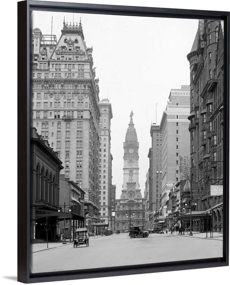 <p>This is a vintage photograph in black and white of downtown Philadelphia. Tall buildings line the street that has cars driving in it with a clear view of the city hall tower at the end.</p>