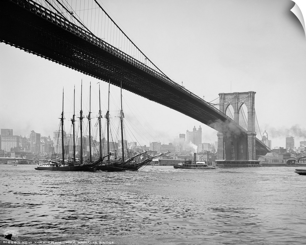 <p>Horizontal, vintage photograph of an old ship passing beneath the Brooklyn Bridge, along the East River, the New York City skyline in the background.</p>