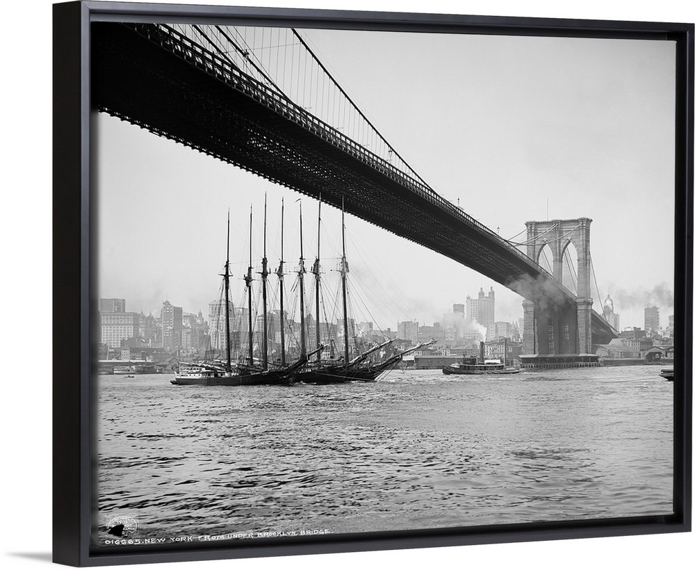<p>Horizontal, vintage photograph of an old ship passing beneath the Brooklyn Bridge, along the East River, the New York City skyline in the background.</p>