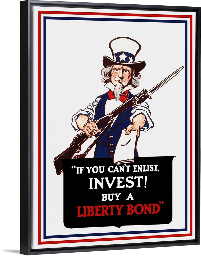 <p>Vintage poster of Uncle Sam holding a rifle and holding out a liberty bond.</p>