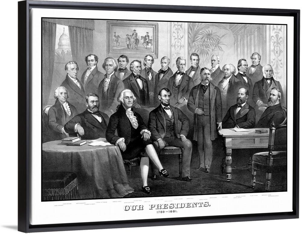 <p>Vintage American history print of the first twenty-one Presidents of The United States seated together in The White House. It reads, Our Presidents. 1789 - 1881. Included presidents are from right to left, James Madison, James Monroe, Martin Van Buren, Ulysses S. Grant, Thomas Jefferson, Franklin Pierce, George Washington, Zachary Taylor, John Tyler, William Henry Harrison, Abraham Lincoln, Andrew Jackson, James K. Polk, Chester Arthur, James Buchanan, John Adams, Andrew Johnson, James Garfield, Millard Fillmore, John Quincy Adams, and Rutherford B. Hayes.</p>