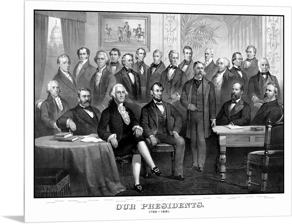 <p>Vintage American history print of the first twenty-one Presidents of The United States seated together in The White House. It reads, Our Presidents. 1789 - 1881. Included presidents are from right to left, James Madison, James Monroe, Martin Van Buren, Ulysses S. Grant, Thomas Jefferson, Franklin Pierce, George Washington, Zachary Taylor, John Tyler, William Henry Harrison, Abraham Lincoln, Andrew Jackson, James K. Polk, Chester Arthur, James Buchanan, John Adams, Andrew Johnson, James Garfield, Millard Fillmore, John Quincy Adams, and Rutherford B. Hayes.</p>